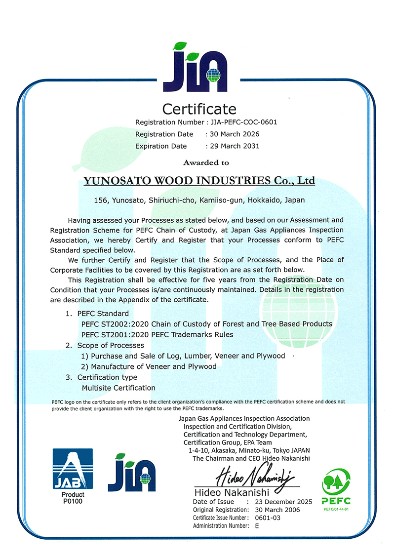 平成18年3月にPEFC-CoC認証を取得しました。